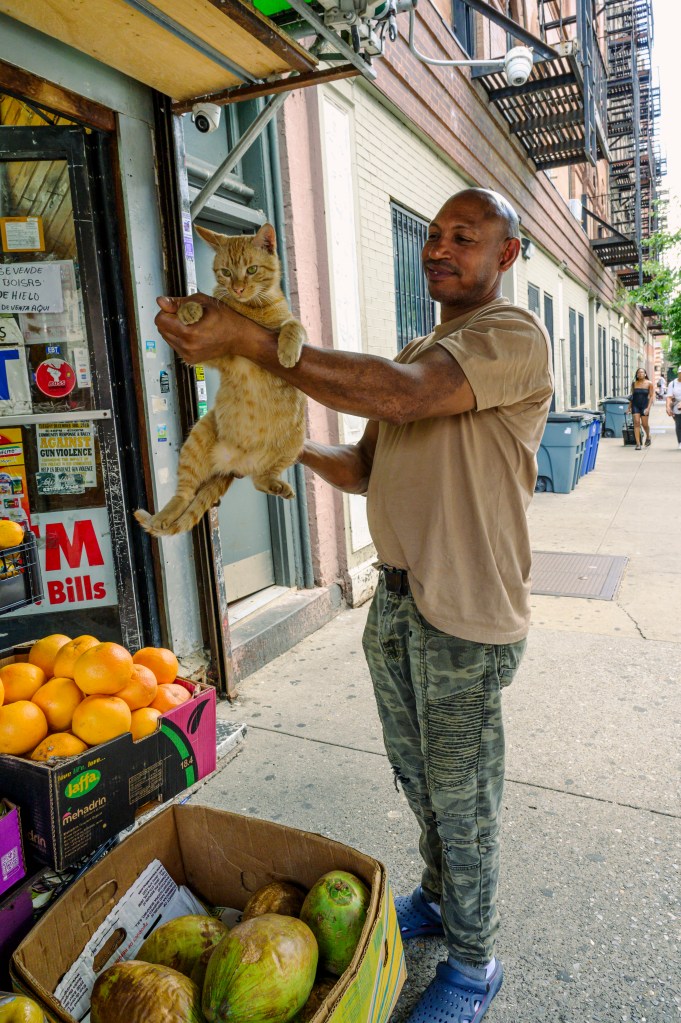 A man with his cat outside a grocery store on Courtlandt Avenue, Thursday, Jun. 27, 2024, in New York City, New York.